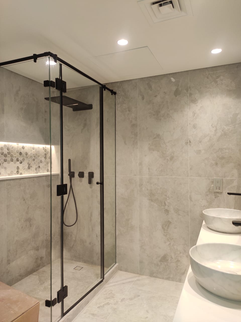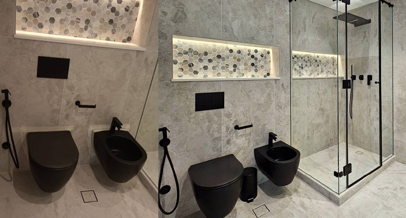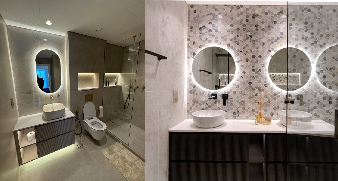 The bathrooms were completely overhauled, including the powder room, daughter’s bathroom, and master bathroom. Each was fully demolished and fitted with new electrical and plumbing lines, water-resistant gypsum ceilings, and new floor and wall tiles. We achieved a sophisticated design by concealing flush tanks behind new ledge walls and installing modern sanitary wares like new rain shower systems, contemporary drainage, and new sinks with mixers. The master bathroom was further enhanced by converting the existing bathtub into a spacious shower area.