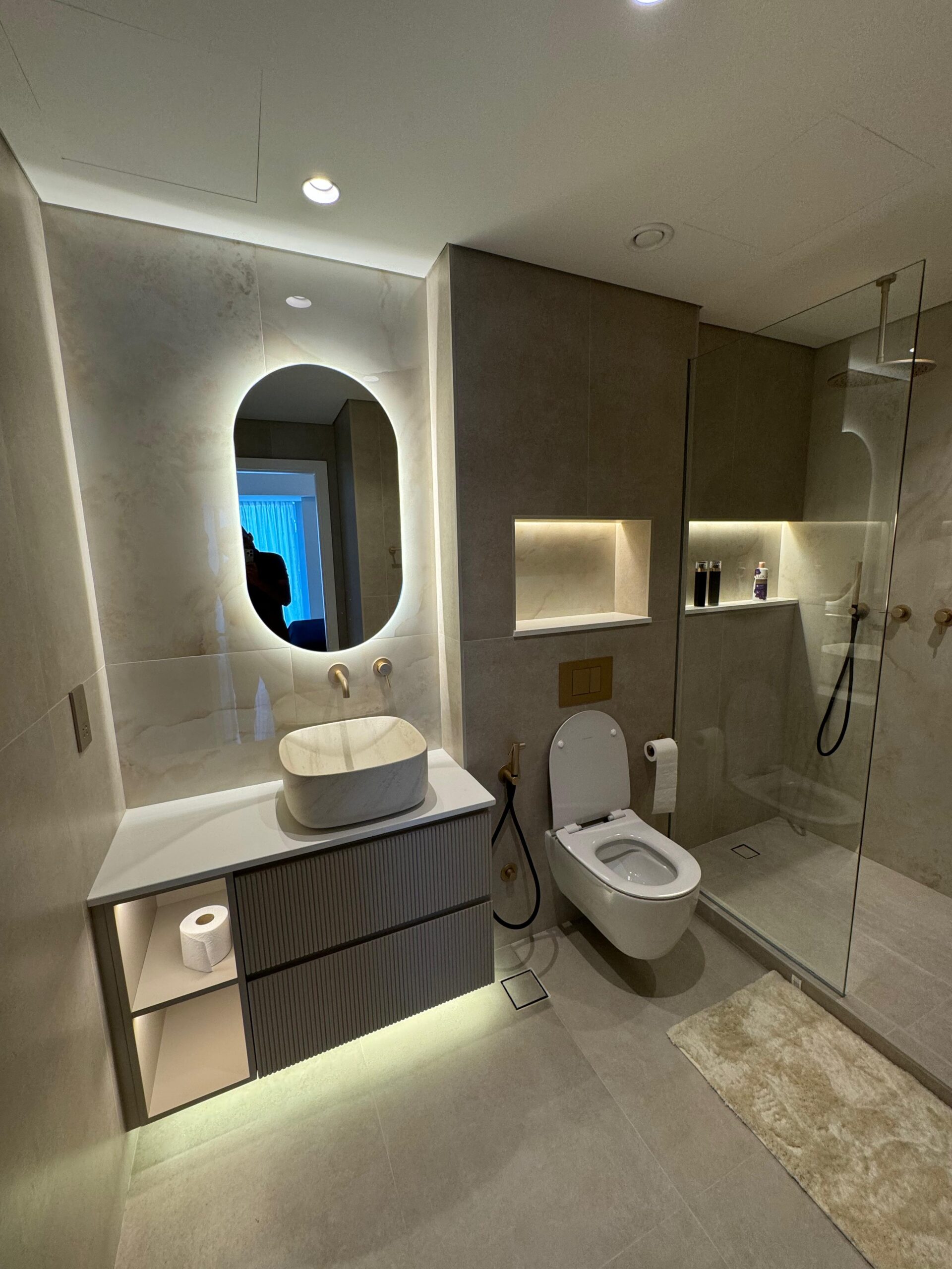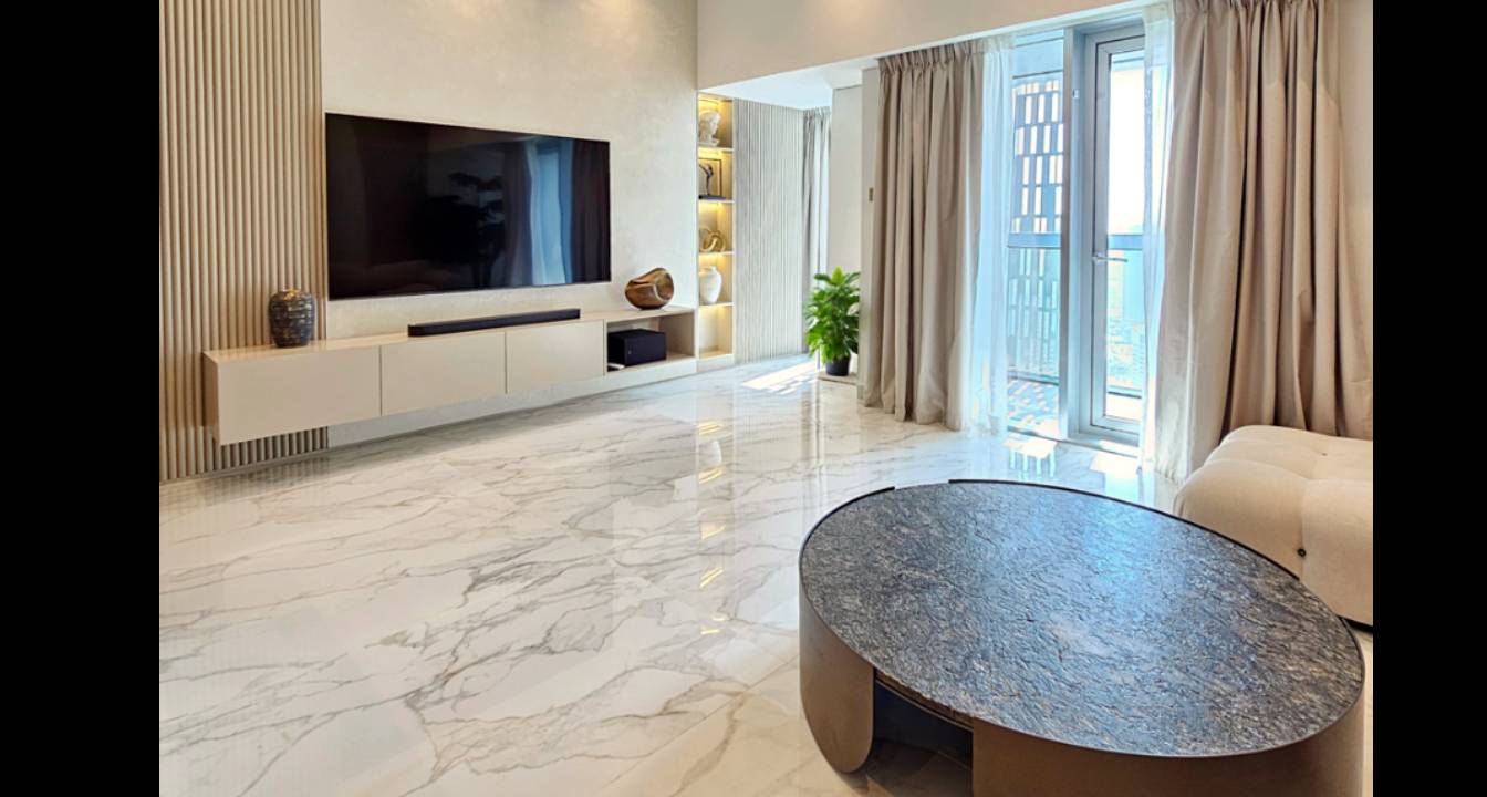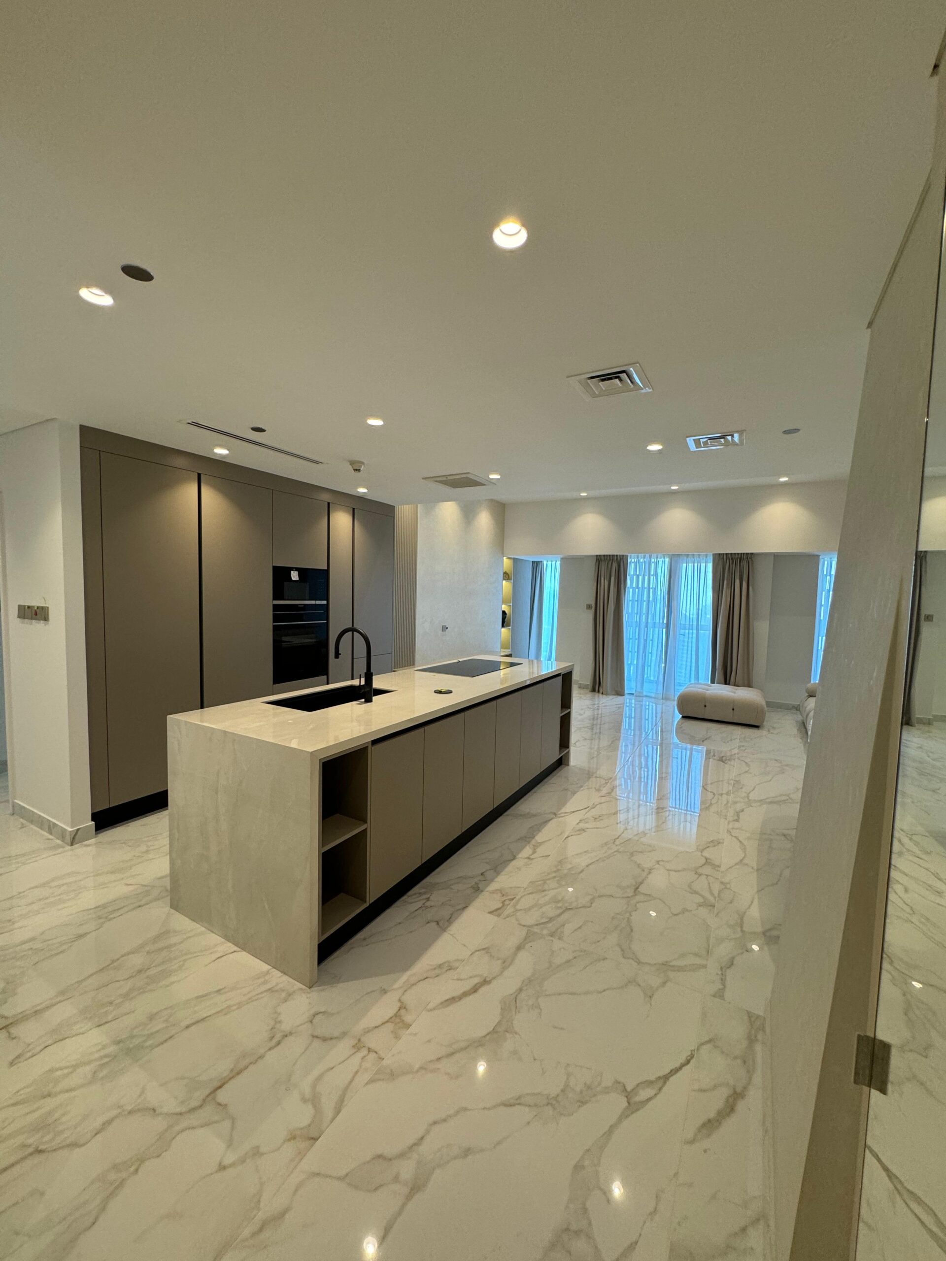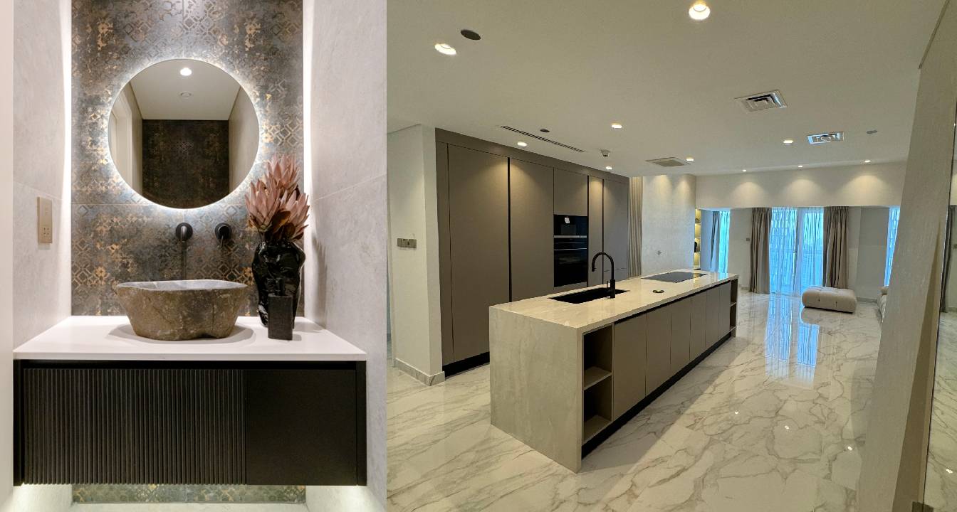 In this project Cayan Tower, our company undertook a full-scale renovation to deliver a modern and cohesive living space. We began by transforming the layout with a key demolition of the kitchen wall to create an open-plan kitchen, which was then fully refurbished with new plaster, a water-resistant gypsum ceiling, and new electrical and plumbing lines to support modern appliances. The existing flooring across a 130 sqm area was demolished and replaced with new screeding and large slab tiles, providing a seamless and uniform look throughout the apartment.