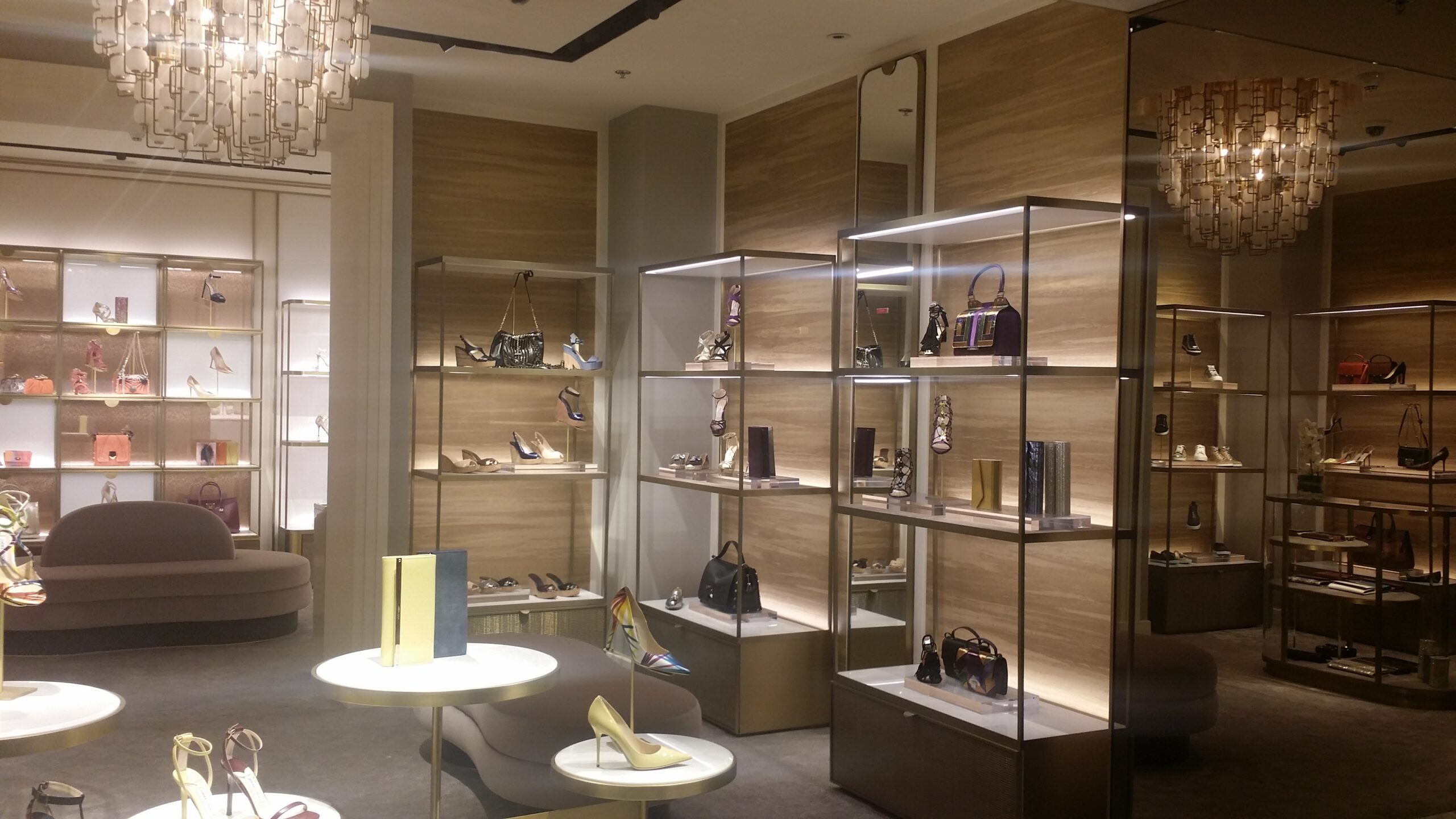 PROBE INTERIORS LLC completely transformed the Jimmy Choo store at The Dubai Mall, focusing on delivering a luxurious and sophisticated new interior design. The project began by preparing the foundation with a new cement and sand screed to ensure a perfect base for the high-end floor finishes. This included the expert installation of client-supplied Laminam/marble Calacatta Oro and plush carpets in the main sales areas, with the different materials seamlessly joined by elegant silk-brushed brass L-shape trims.